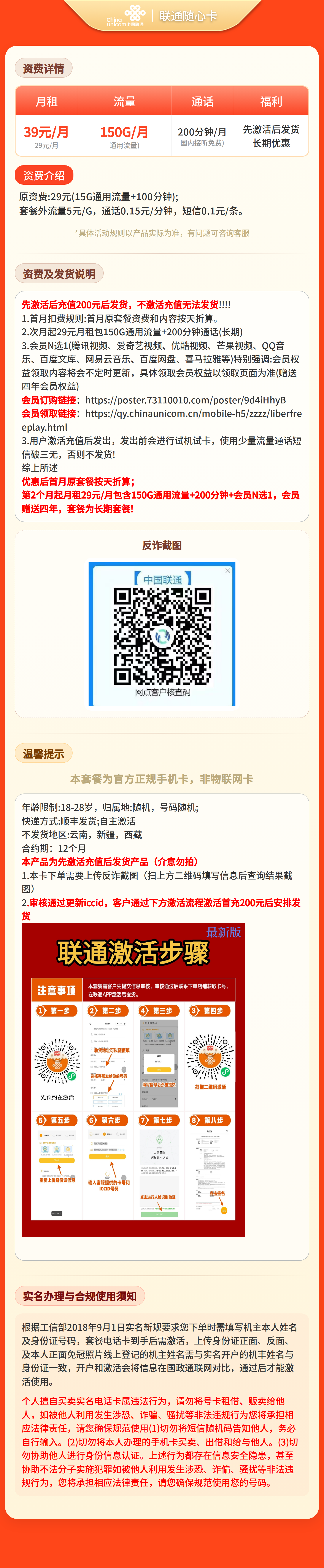 联通随心卡29元150G+200分钟+会员【发全国】先激活充值后发货套餐详情
